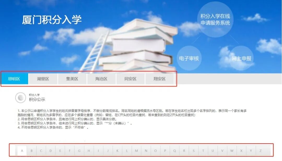 选择您的报名所在区。 在字母栏目下,查找您的孩子。 积分公示以申请人子女的姓氏拼音首字母进行排序,不做分数高低排名。